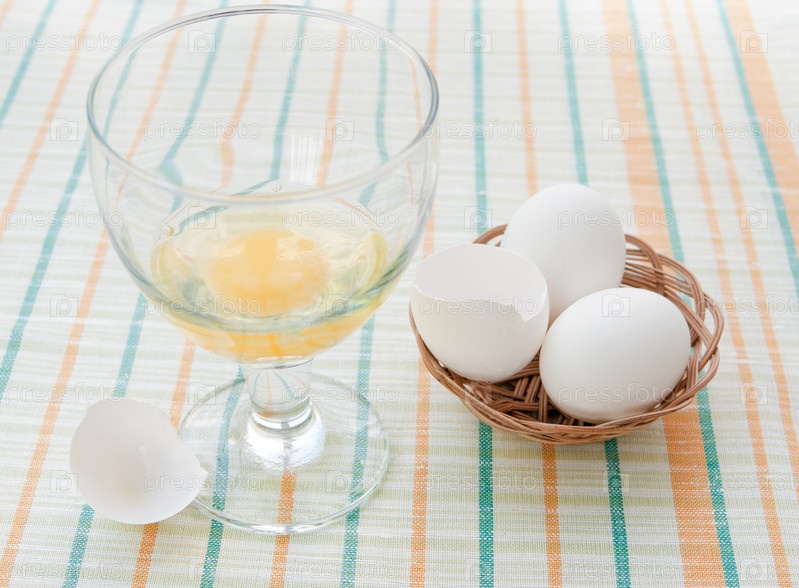 Разбитое яйцо в стеклянном бокале и два целых в корзинке на столе