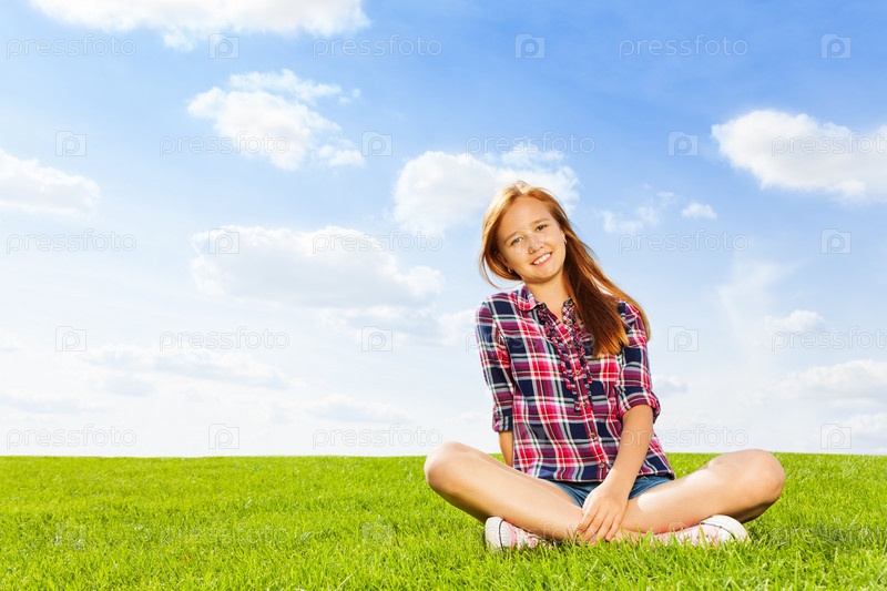 Красивая девочка сидит на траве