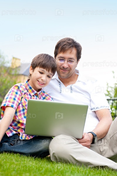 Отец и сын, сидящие на зеленой траве с ноутбуком