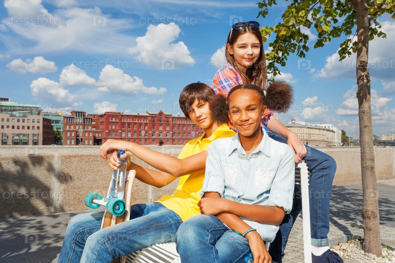 Группа детей на скамейке в городе