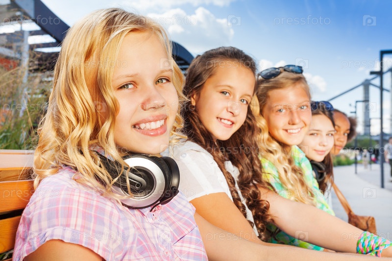 Группа детей на скамейке в городе