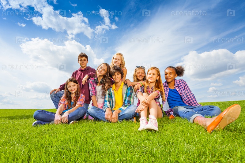 Счастливые дети сидят на лугу