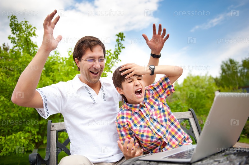 Счастливые отец и сын, сидящие за столом за ноутбуком