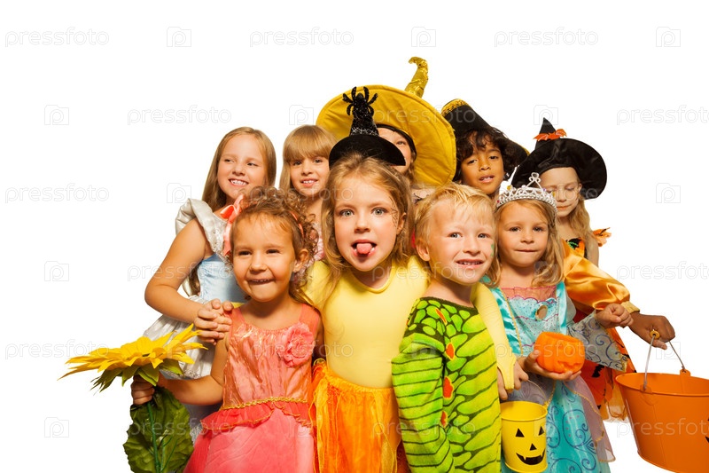Большая группа детей в костюмах для Хэллоуина