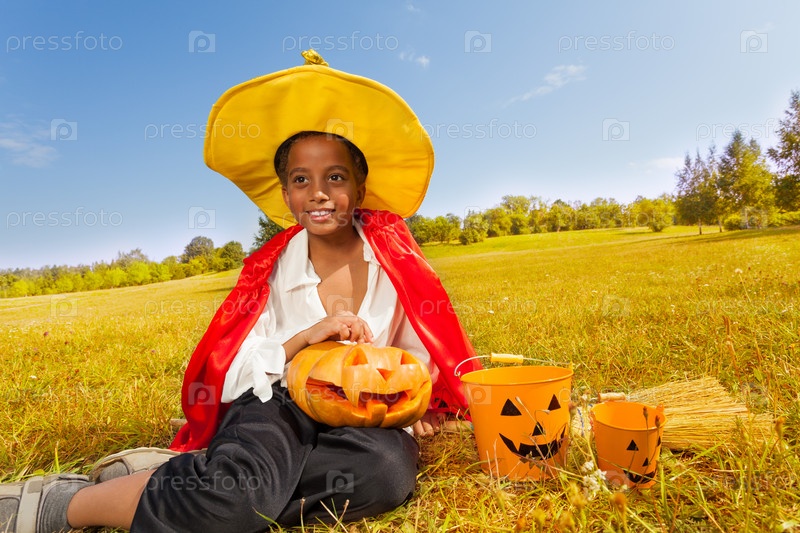 Мальчик сидит на траве с тыквой для Хэллоуина