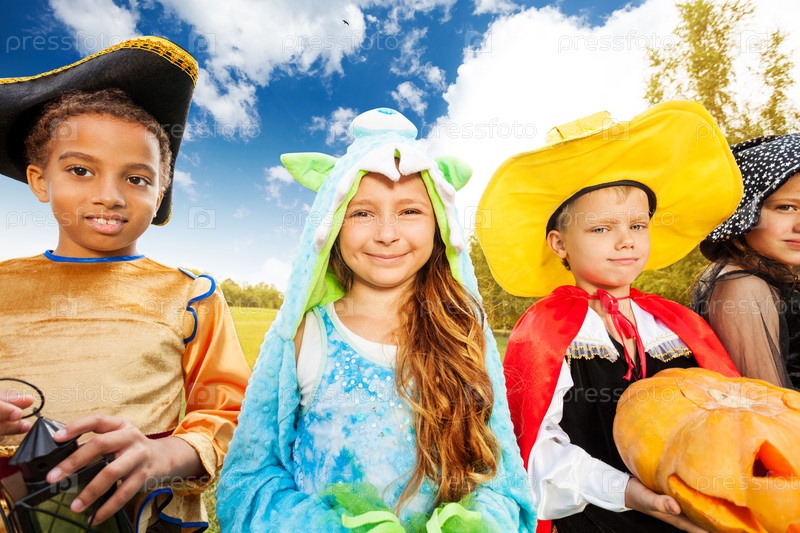 Дети в различных костюмах для Хэллоуина или карнавала