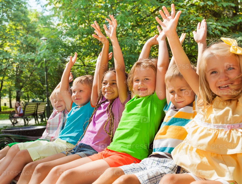 Большая группа детей на скамейке
