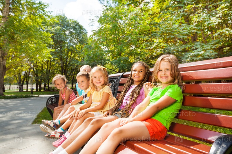 Мальчики и девочки на скамейке в парке