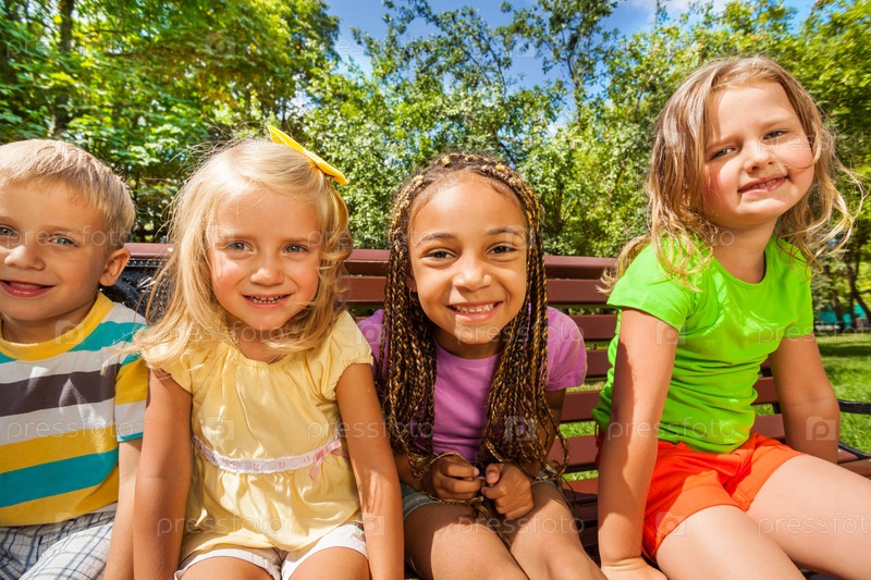 Мальчики и девочки на скамейке в парке