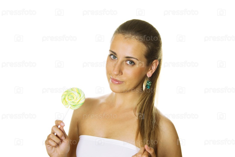 Привлекательная молодая женщина с ярким леденцом. Изолирована на белом фоне