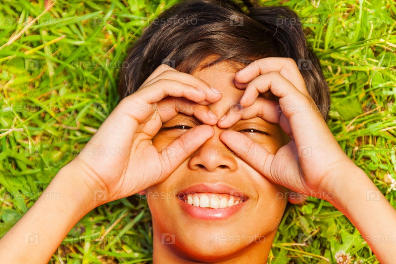Счастливый улыбающийся мальчик лежит на траве