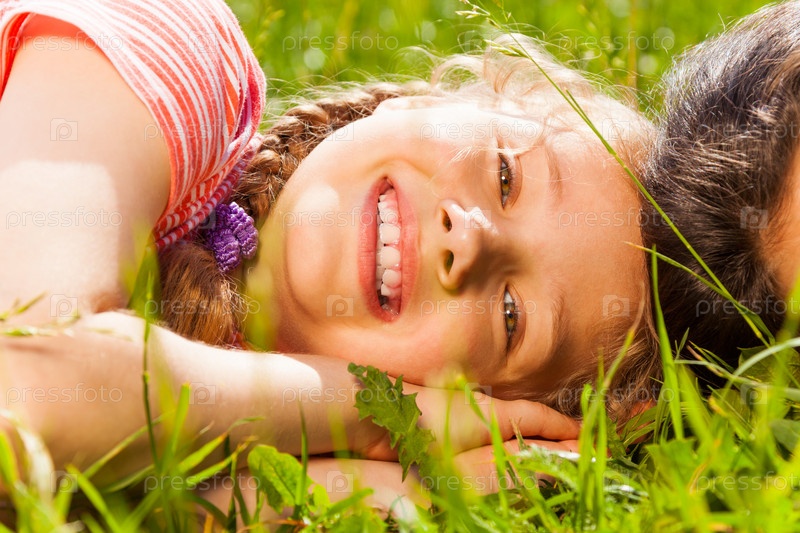 Счастливая девочка лежит на зеленой траве