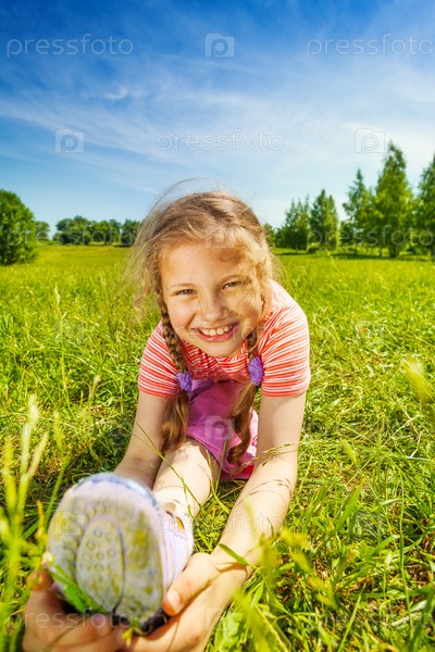Счастливая девочка лежит на зеленой траве