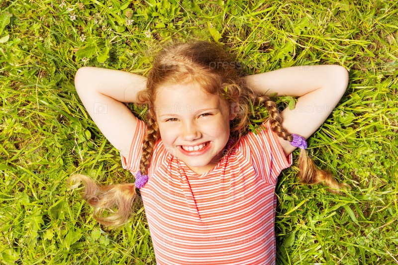 Счастливая девочка лежит на зеленой траве