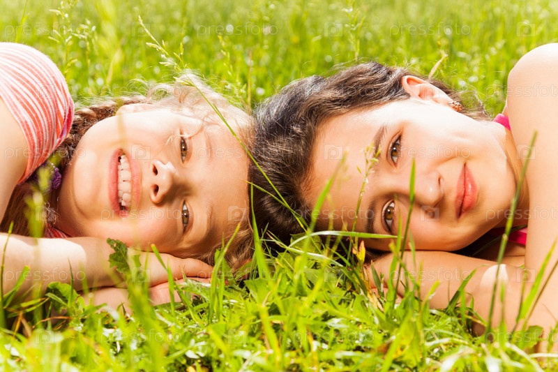 Портрет двух красивых девочек на поляне