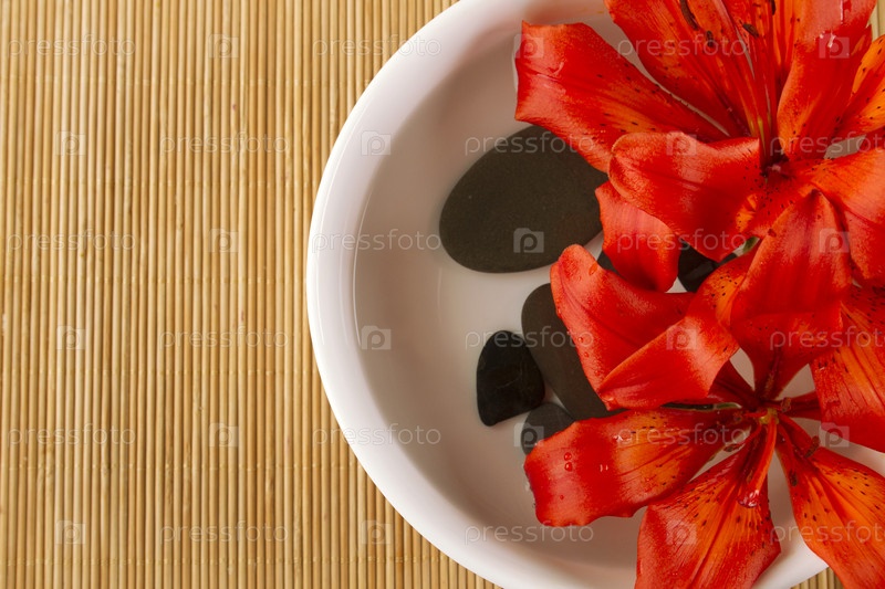 Цветы лилии в миске с водой и камнями. Спа-салон