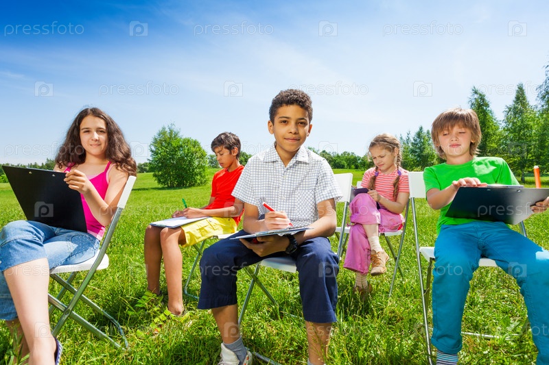 Дети с планшетами на поляне