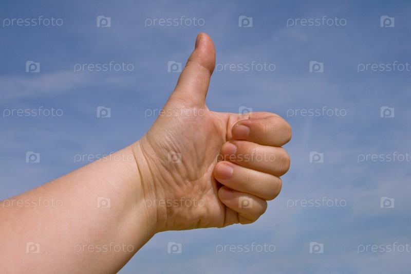 Большой палец на фоне голубого неба