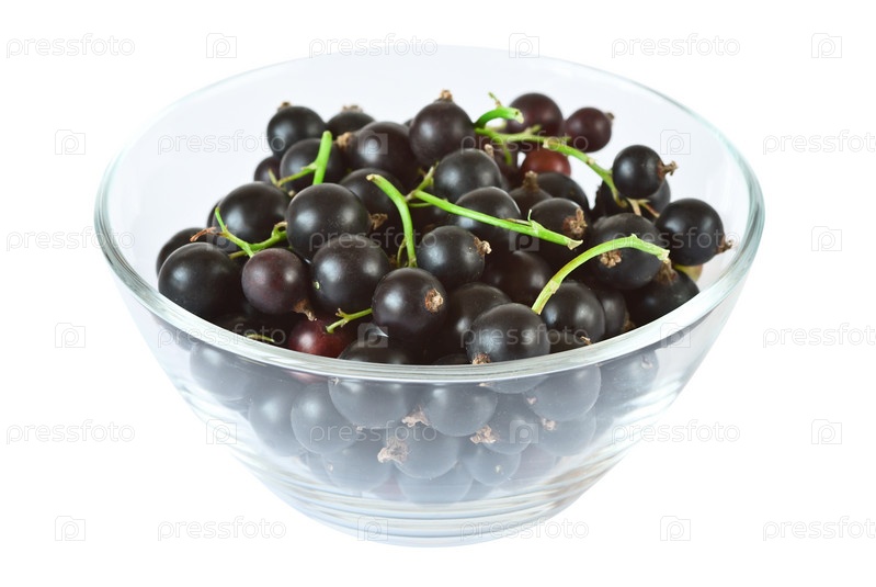 Черная смородина в стеклянной чашке на белом фоне
