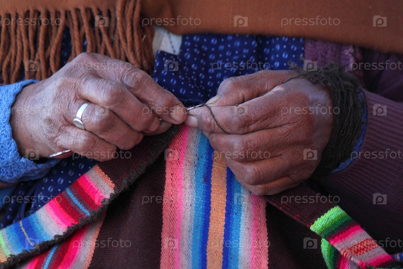 Руки старой перуанской женщины, занимающейся вязанием