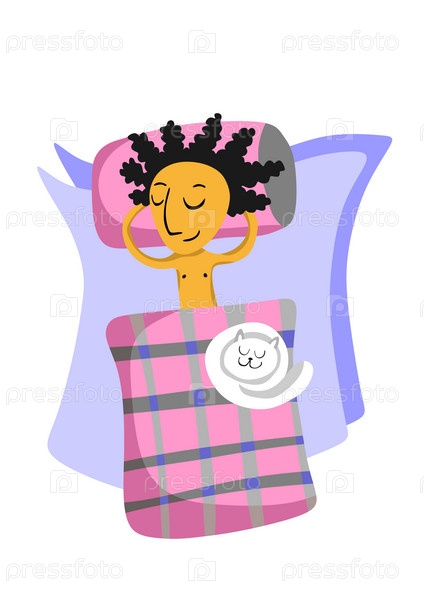 Векторная иллюстрация молодого человека, спящего в постели с кошкой