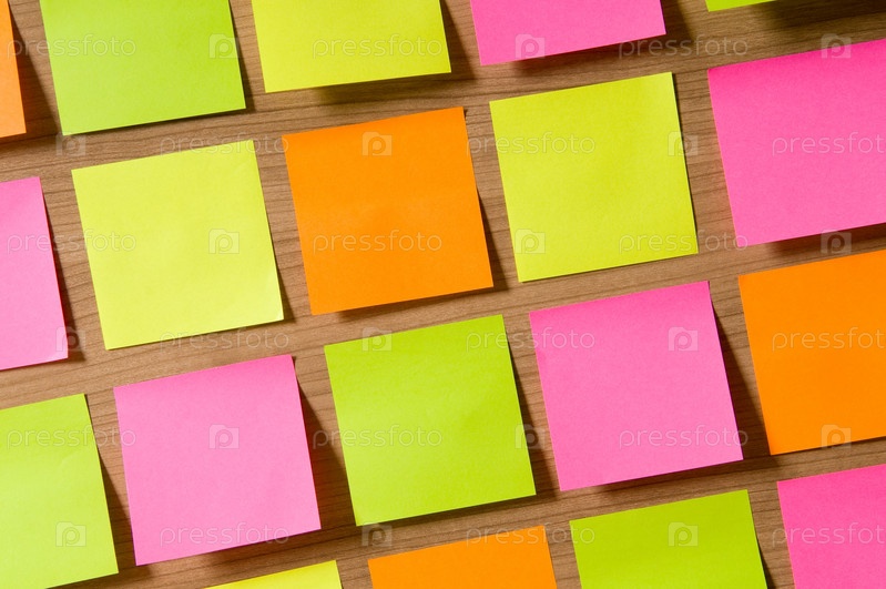 Разноцветные чистые стикеры на деревянной поверхности