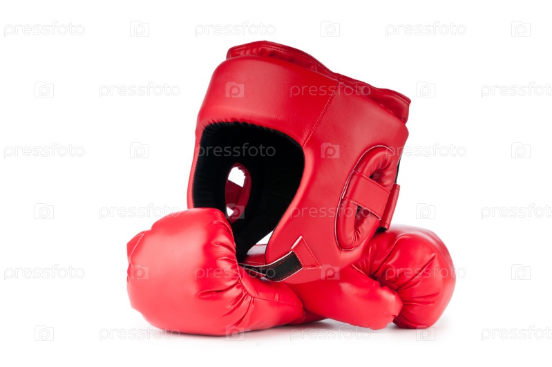 Красный боксерский шлем и пара перчаток на белом фоне