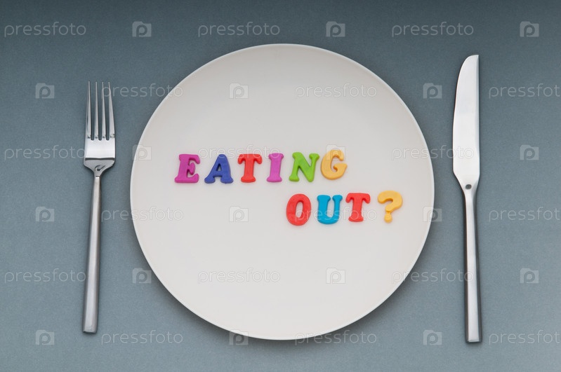 Фраза EATING OUT? на тарелке, на сером фоне