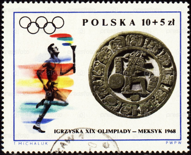 Польская почтовая марка 1968 года, изображающая спортсмена с факелом, посвященная Олимпийским играм в Мехико