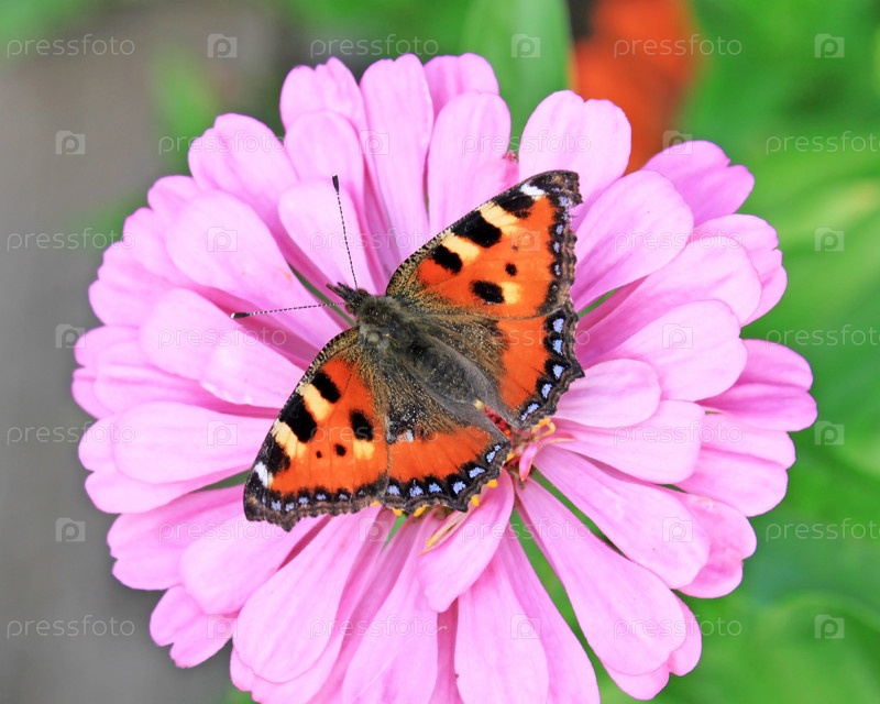 Красивая бабочка на розовом цветке цинии