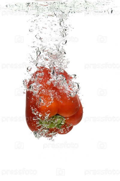 Красный болгарский перец падает в воду на белом фоне