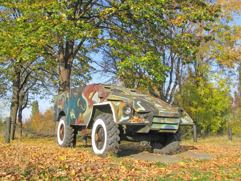 Бронетранспортер на постаменте в осеннем парке