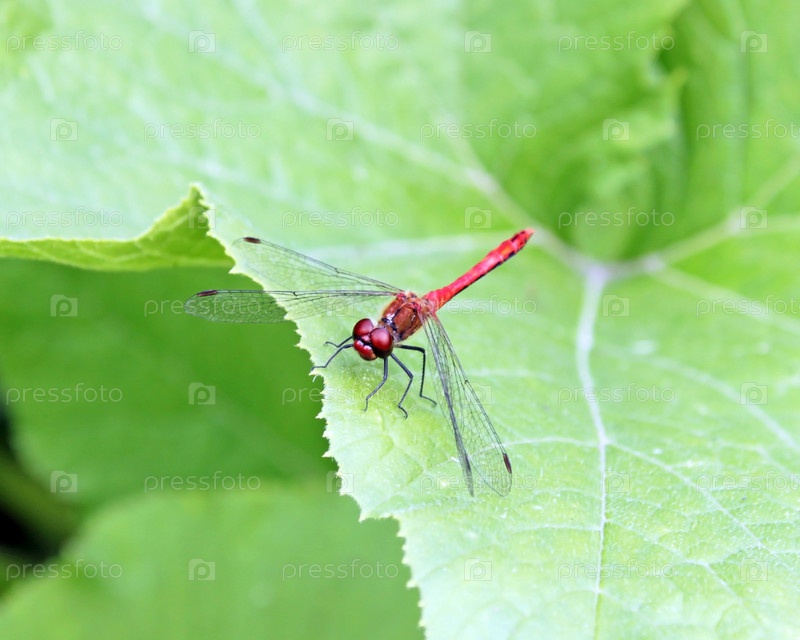 Красная стрекоза на зеленом листе