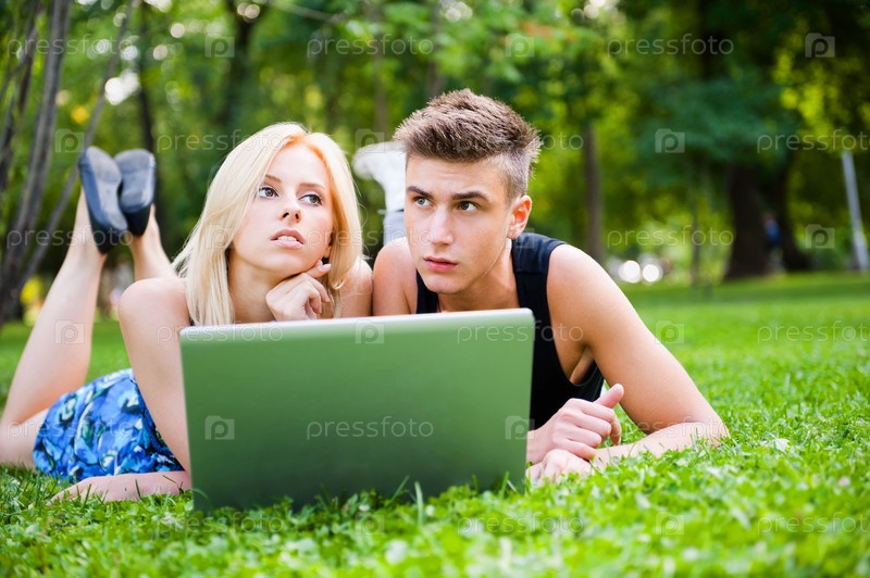 Молодая пара с ноутбуком в парке