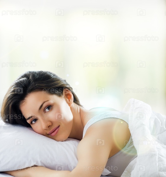 Красивая молодая женщина лежит в кровати