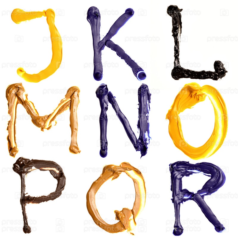 Буквы английского алфавита от J до R, нарисованные гуашью на белом фоне