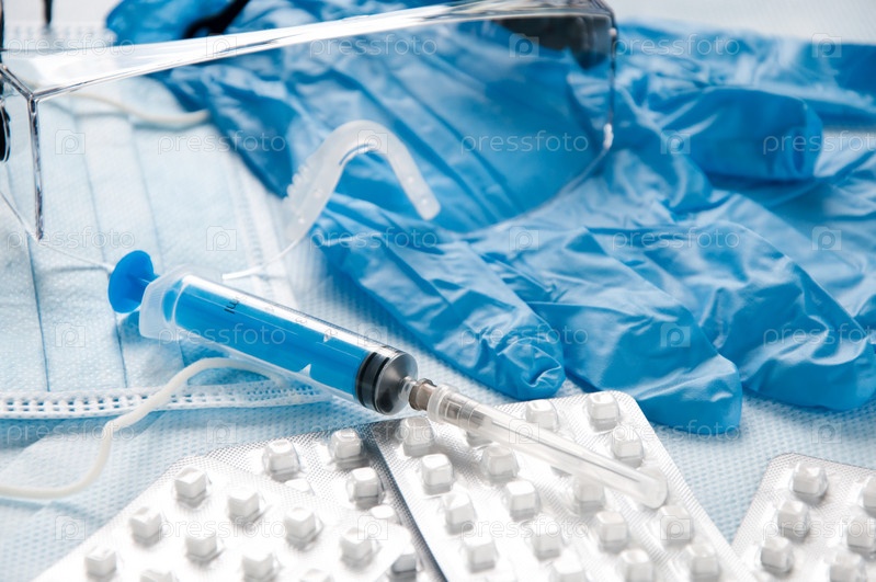 Блистеры с таблетками и медицинские принадлежности, крупный план
