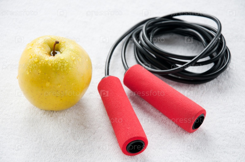 Яблоко и скакалка на белом полотенце
