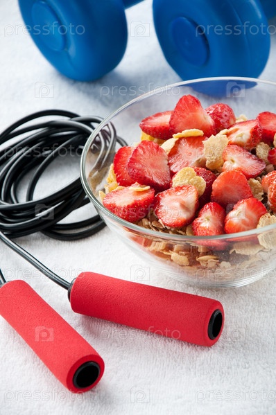 Тарелка мюсли со свежей клубникой, скакалка и гантели