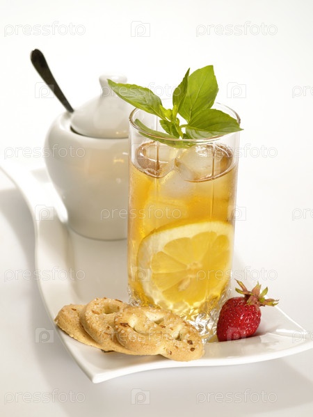 Холодный черный чай с лимоном, лед и капли воды на поверхности стекла