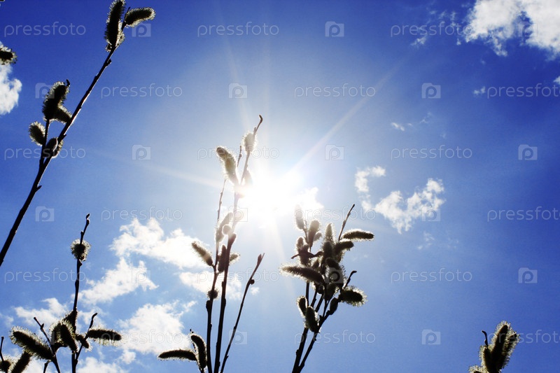 Ветки цветущей ивы на фоне неба