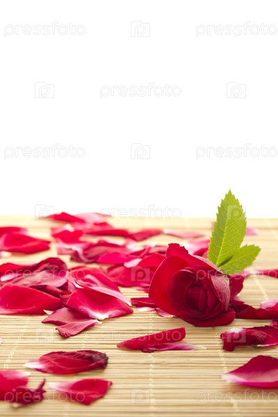 Красивые красные лепестки роз рассеяны по деревянной поверхности