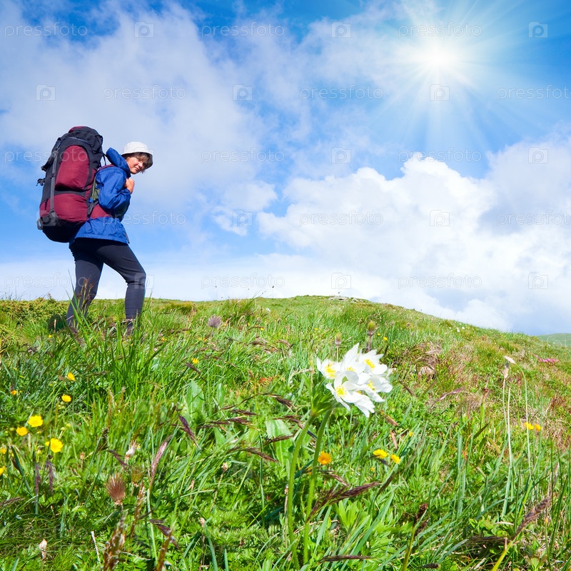 Женщина с туристическим рюкзаком в горах
