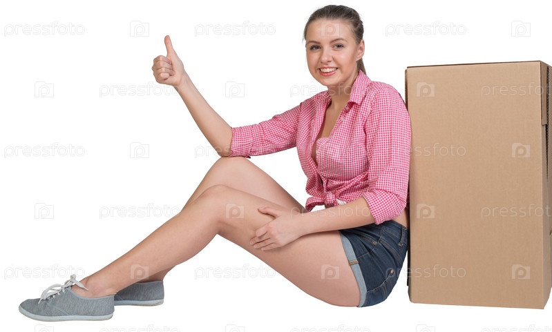 Женщина сидит рядом с картонной коробкой