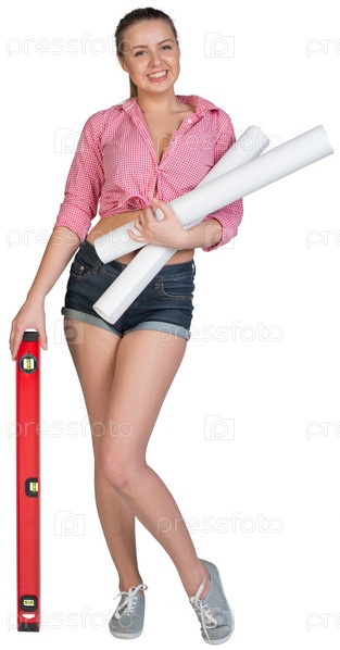 Женщина держит строительный уровень
