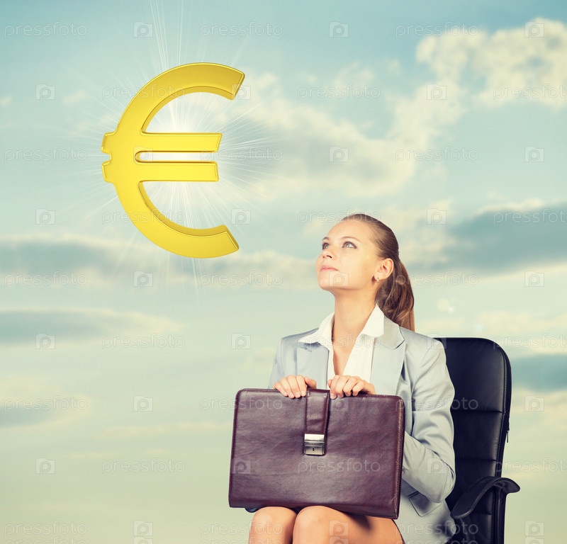 Бизнес-леди смотрит на знак евро в воздухе