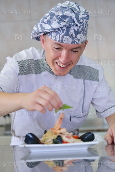 Шеф-повар готовит блюдо на кухне