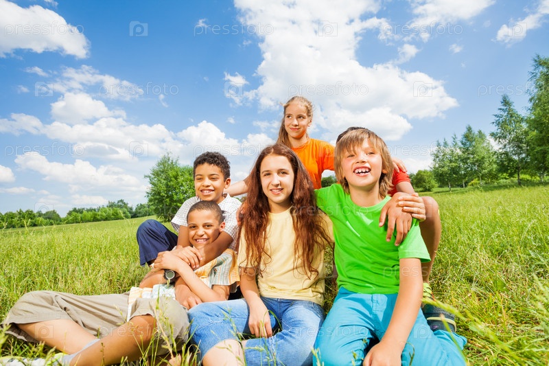 Счастливые улыбающиеся дети на поляне