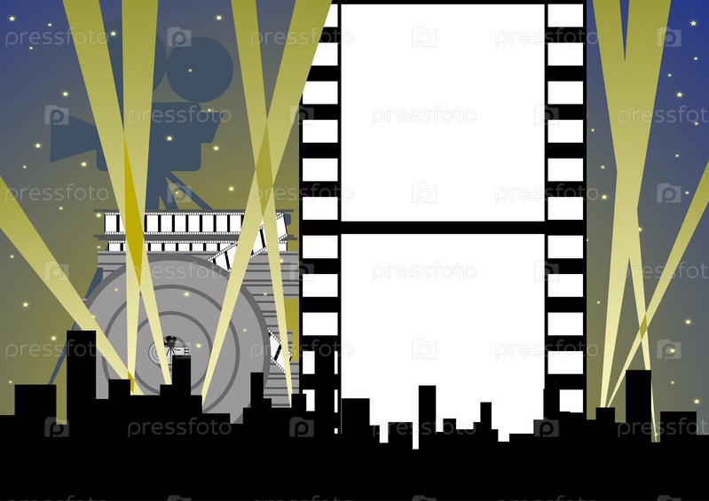 Силуэт города на фоне прожекторов и кинопленки. Мир кино