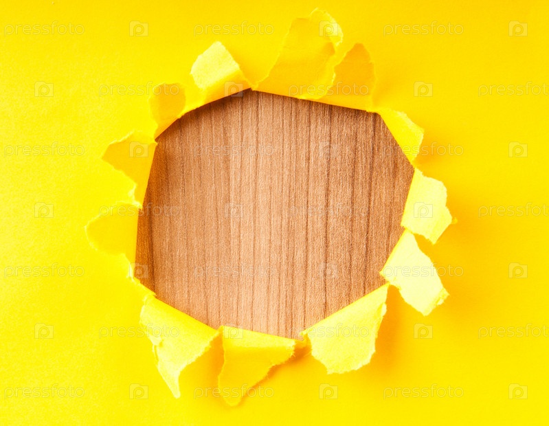 Рваная желтая бумага на деревянном фоне